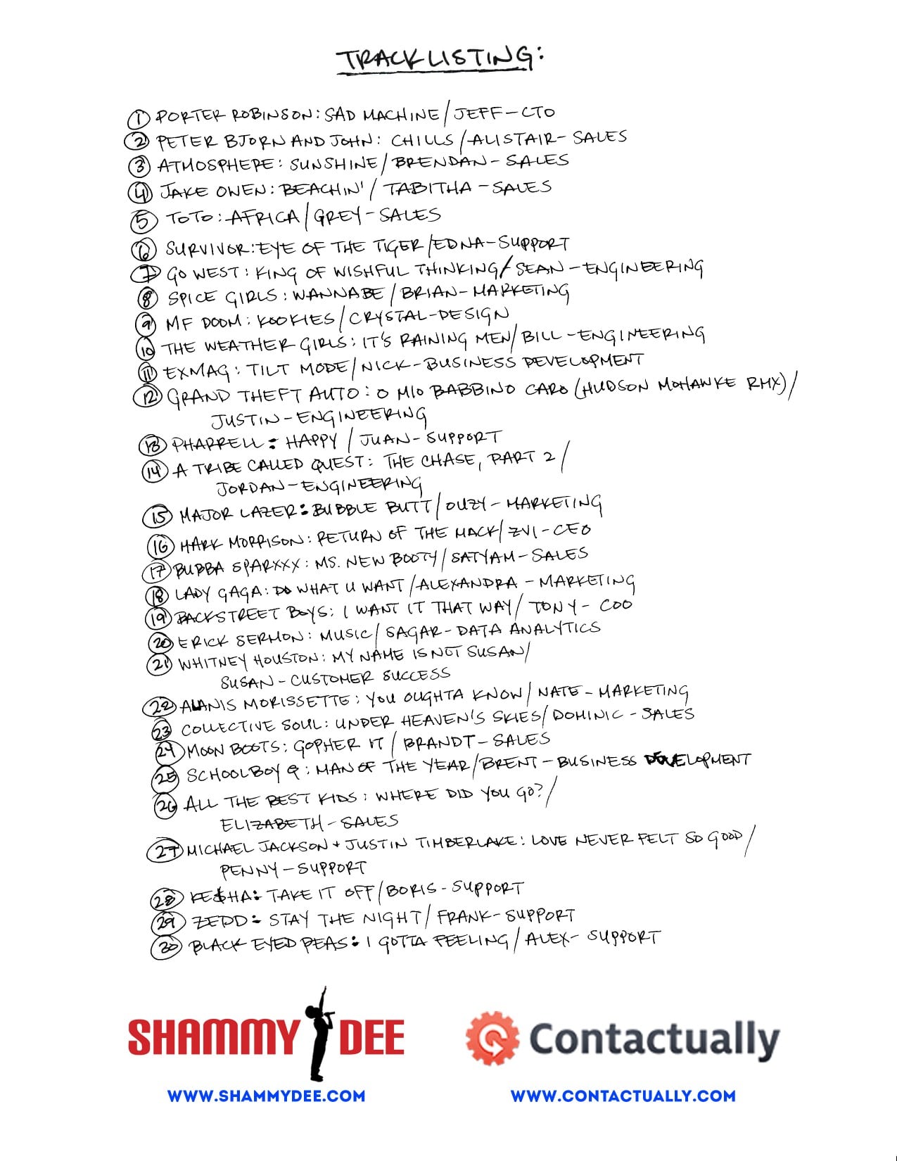 This mix is my first “crowd-sourced mix” where the Contactually team in Washington D.C. selected 30 songs for me to mix together. This has to be one of the most eclectic mixes I’ve ever done, with artists that range from Toto and the Backstreet Boys to MF Doom and Lady Gaga. This was so much fun to do. You are in for a treat! Shoutouts to Elizabeth and the whole Contactually team for being a part of this!They also did a dope interview about how I use the program. Check out the interview here!Check out the tracklisting: